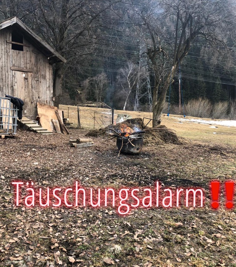 Als die Einsatzmannschaften eintrafen, konnte tatsächlich eine leichte Rauchsäule ausgemacht werden. Diese rührte jedoch von einem in einer Feuerschale befindlichem Zweckfeuer.